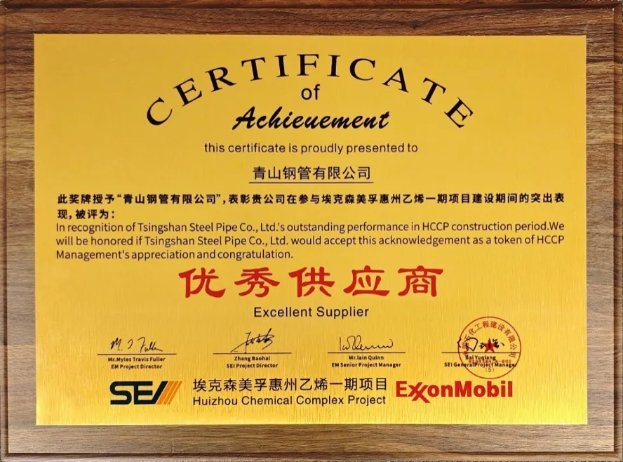 近日,青山鋼管有限公司憑借其卓越的產品質量、專業的技術實力和及時高效的售后服務,榮獲中石化SEI埃克森美孚惠州乙烯一期項目的“優秀供應商”稱號。
