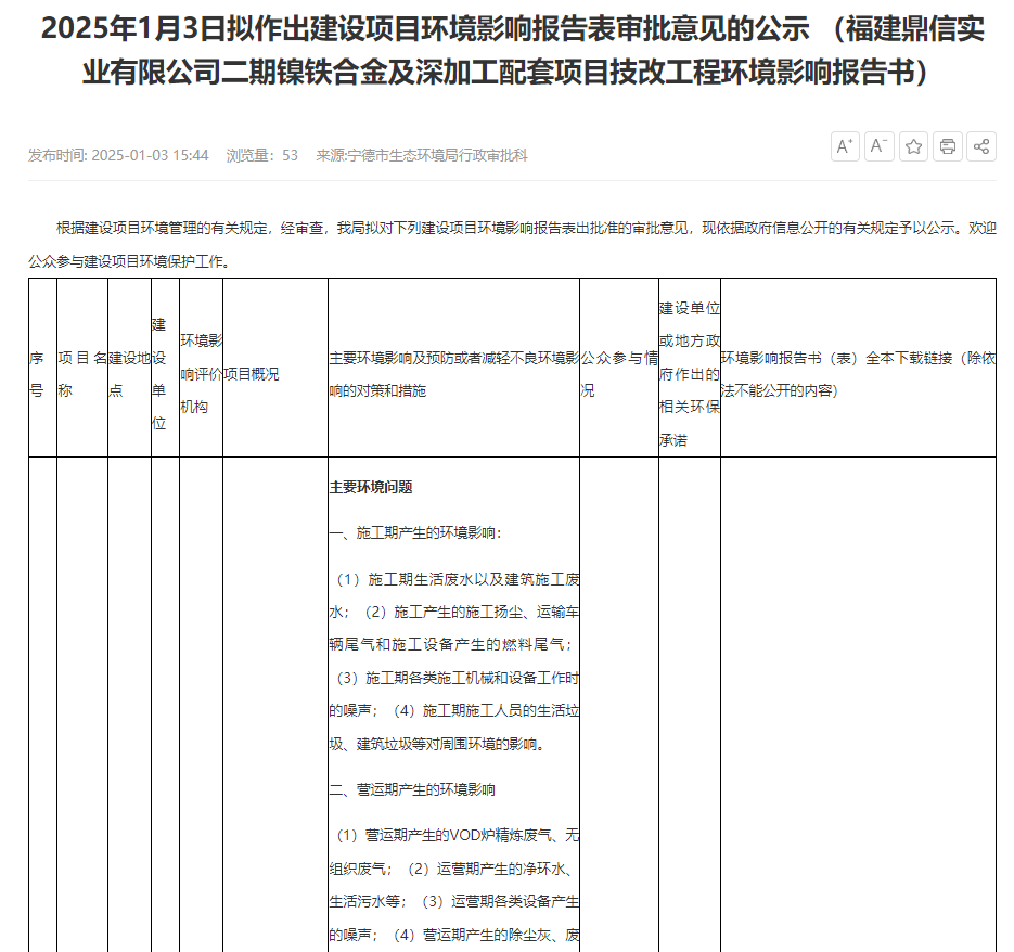 2025年1月3日,寧德市生態環境局就福建鼎信實業有限公司二期鎳鐵合金及深加工配套項目技改工程環境影響報告書作出審批意見并對外進行公示,公示時間:2025年1月3日-2025年1月9日(5個工作日)。