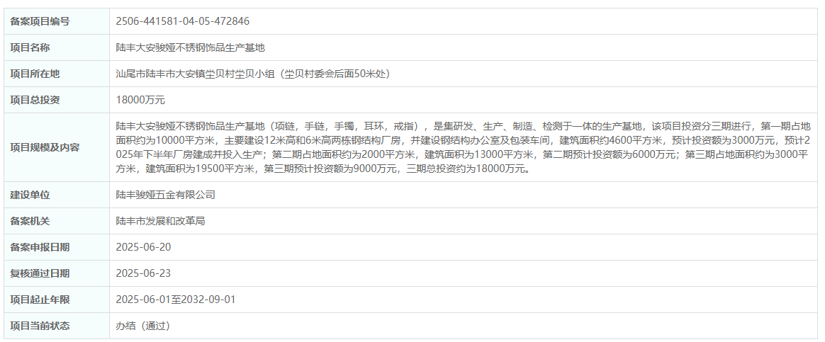 2025年6月23日,汕尾市陸豐大安駿婭不銹鋼飾品生產基地備案復核獲通過。