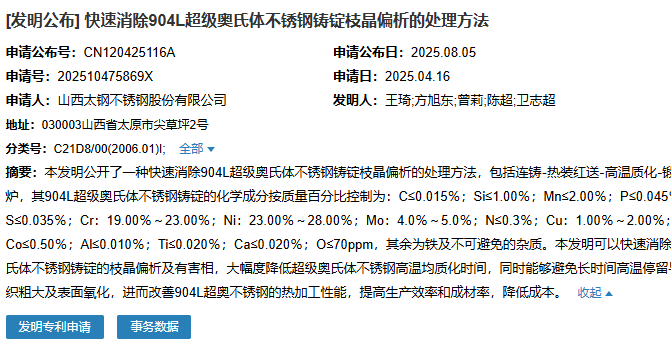 2025年8月5日,山西太鋼不銹鋼股份有限公司成功申請一項名為“速消除904L超級奧氏體不銹鋼鑄錠枝晶偏析的處理方法”專利,申請公布號為CN120425116,申請日期為2025年4月16日。